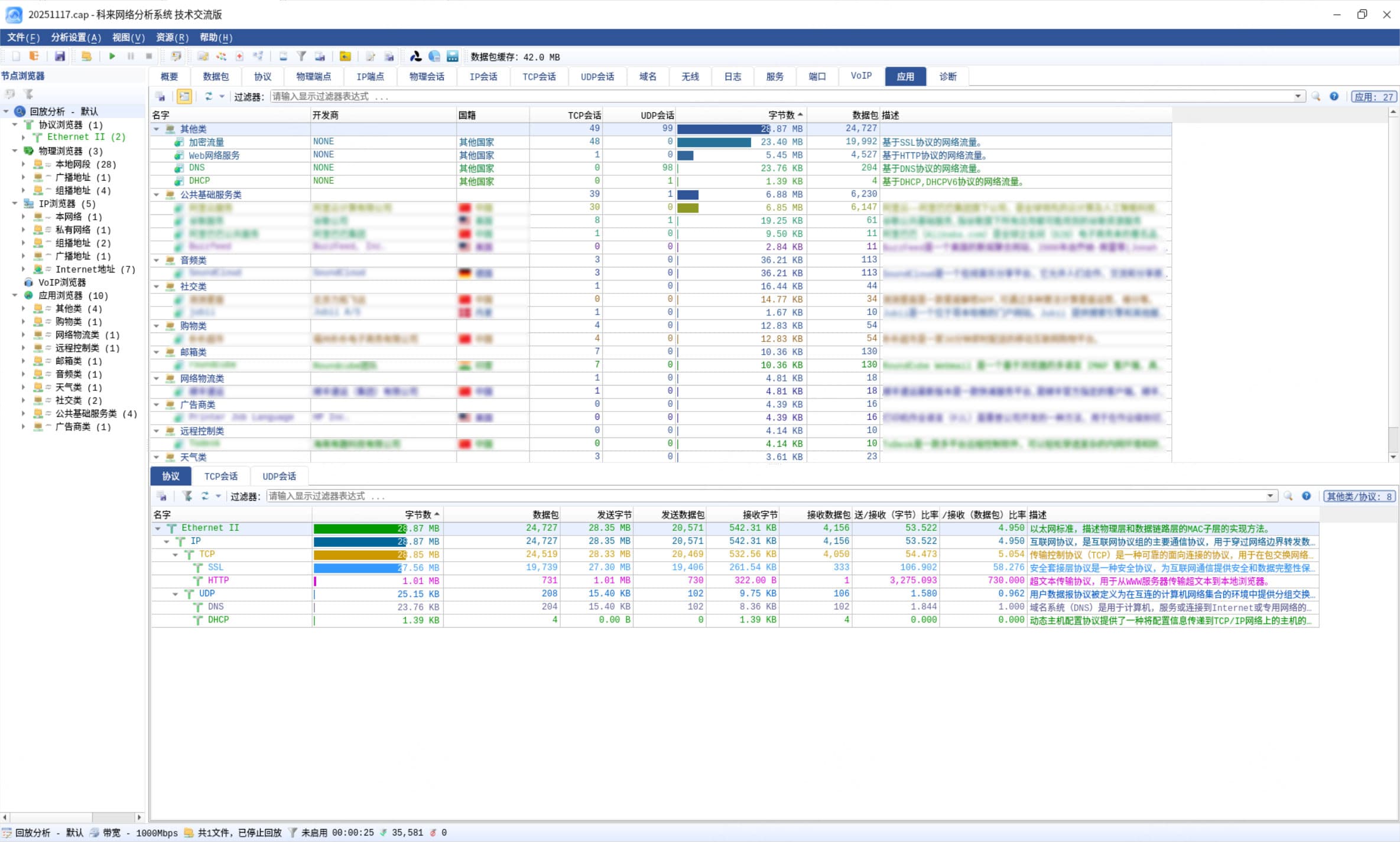 系统支持对多类网络应用协议实时解码,以协议树形式全景展现数据包信息,可提供数据包中、英文双语解码。
